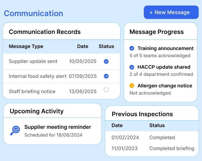 Establish the who, what, and how of your communication. Outline what food safety information needs to be shared, internal and external recipients, as well as communication channels. Identify communication triggers, maintain a communication log, and track/store all related activities in Effivity FSMS.