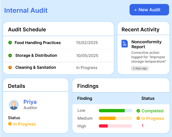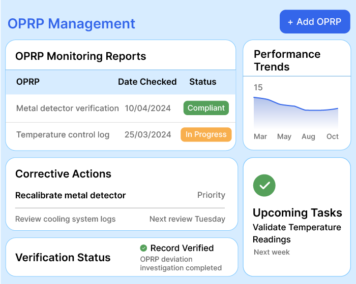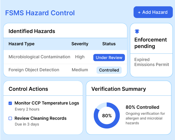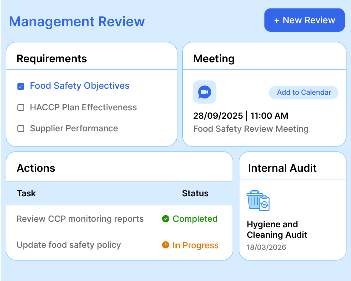 Schedule inspections, verifications, and audits to make compliance a breeze. Set reminders to renew permits, meet deadlines, track task completion, review HACCP plans, prepare reports, etc.