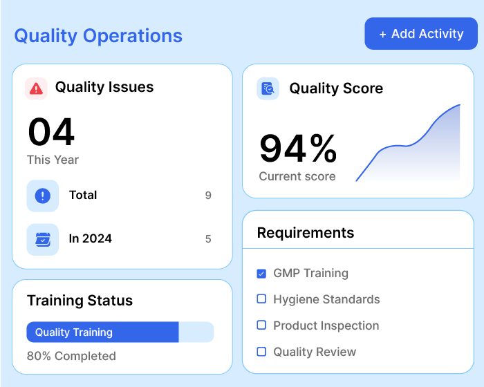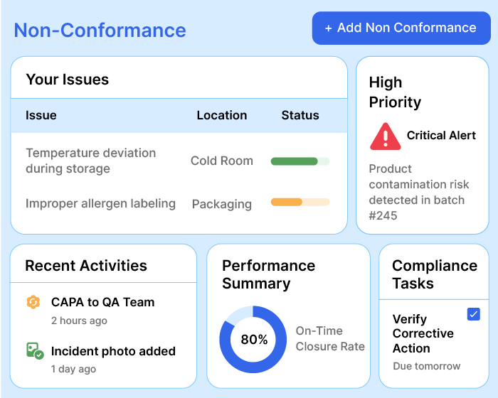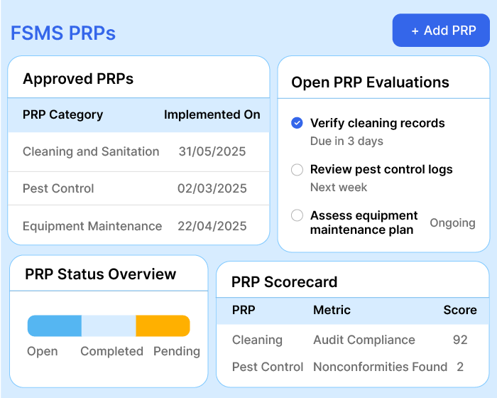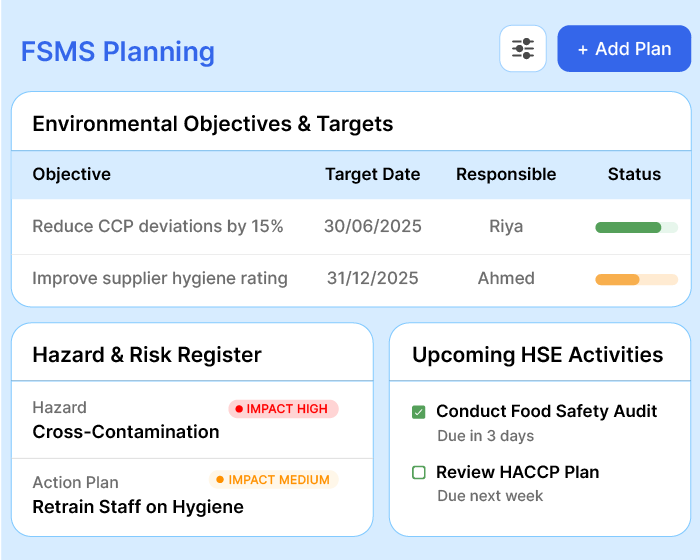 Roll out your FSMS in days and not weeks. Monitor progress, address deviations, and optimize your food safety operations.
