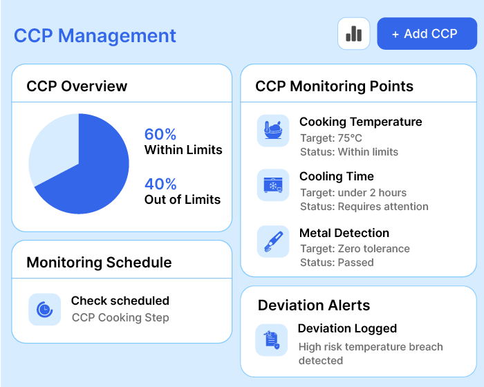 Define corrective actions and link them to CCP deviations. Minimize downtime by automating their implementation and resolving issues instantly.