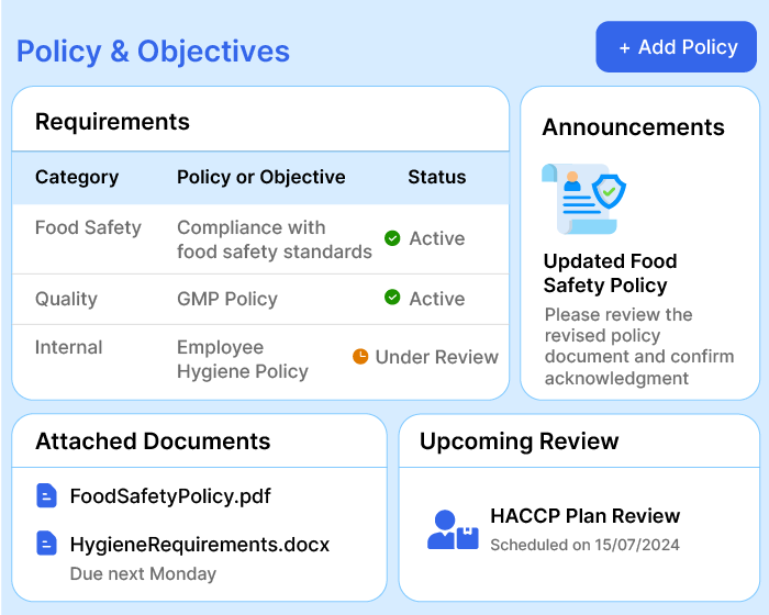 Activate your account and start customizing our software to your business-assign roles, build workflows, document food safety policies and objectives, etc.