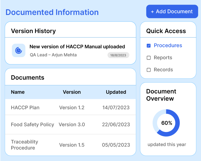 Get the exact food safety coverage you need for your business. Our FSMS offers 15 modules aligned with ISO 22000, allowing you to select and pay only for the features that matter the most to your business.