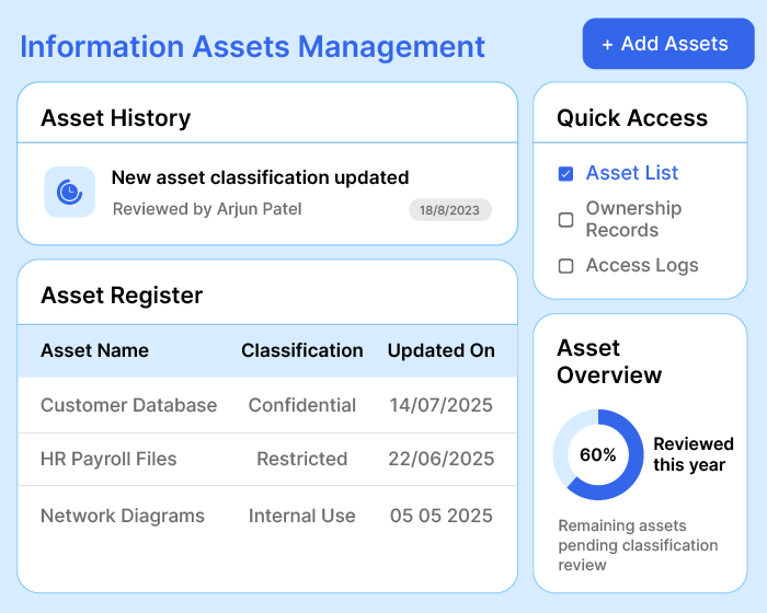 Maintain all your assets in one central hub. Generate information asset inventory. Classify them based on criticality, prioritize security measures, and track their life cycles to minimize vulnerabilities & improve resilience.