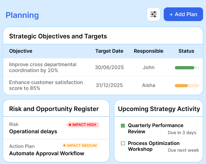 Lay the foundation for success with our Strategy module. Define the context of your organization, set clear objectives, prepare policies, and align your QHSE vision with your IMS software.