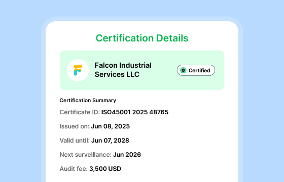 ISO 45001 certification reduces workplace incidents, lowering workers' compensation costs, sick leave, and productivity losses. Organizations typically see measurable safety improvements within the first year.