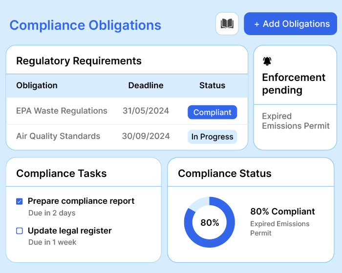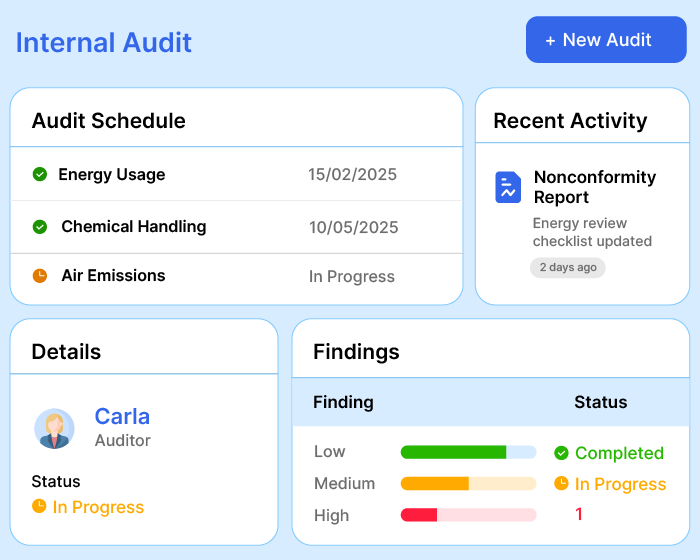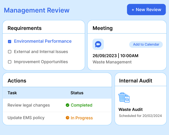 Ensure ISO compliance (14001, 45001, 50001) without sweating about paperwork. Track deadlines, keep up with regulations, perform on-time inspections, and receive regular updates.