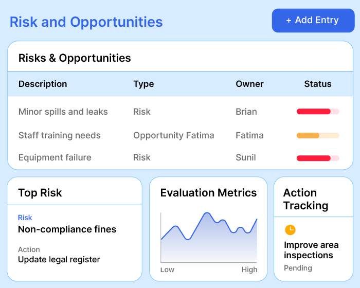 Automate your operational control plan. Carry out aspect-impact and hazard-risk assessments, identify mitigation measures, and reassess effectiveness.